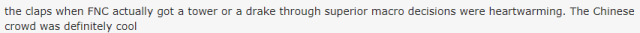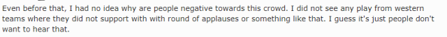 KeraaiL-: 即使在這之前,我完全不能理解對於中國觀眾的負面評價。我沒有見過一次他們不為出戰的任何戰隊,包括西方戰隊,鼓掌支持的。我猜有些人就是故意聽不見吧。