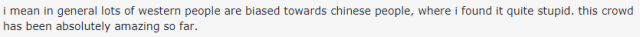 AntilogyOxy: 很多西方人都對中國人有偏見,這十分愚蠢。中國觀眾目前為止非常了不起。