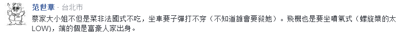 對於搞不好台灣經濟的蔡英文,竟然還如此奢侈,台灣網友紛紛批評蔡英文“蔡家大小姐是富豪人家出身”“嬌貴的空心菜”“騙子菜”。蔡英文逼迫台灣在職公務機關刪減預算,自己卻如此浪費,台網友批評蔡英文“只許州官放火不許百姓點燈”“嚴以律人寬以待己”。(綜編/海外網 張申)