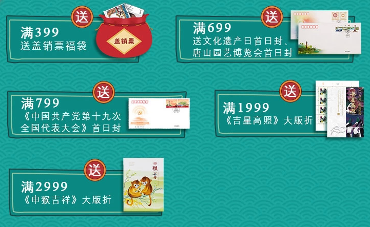 天貓雙11期間,中集郵旗艦店在為消費者帶來珍貴郵票的同時,也籌備了多種不同形式的回饋活動。在11月1日-11日期間,凡收藏店鋪、分享店鋪抽獎信息或任意一筆消費,均可參與轉盤抽獎活動,獲獎者可免費獲得《靈猴獻瑞》、《申猴吉祥》等不同郵票冊或優惠券;在店內消費享受購物滿400減50的滿減優惠,全場購物滿399即可享受包郵服務;同時,根據不同的消費金額,消費者還可獲得包含福袋、主題首日封、《吉星高照》大版折等在內的不同福利贈品。