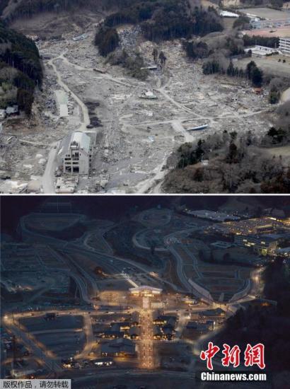 2011年3月22日(上)和2016年3月4日拍攝的日本宮城縣女川市的拼版照片。 2011年3月11日,日本東北部海域發生9.0級強震,引發特大海嘯。由東京電力公司運營的福島核電站因海水灌入導致斷電,造成災難性核泄漏。災難導致超過1.5萬人遇難,2000餘人失蹤。