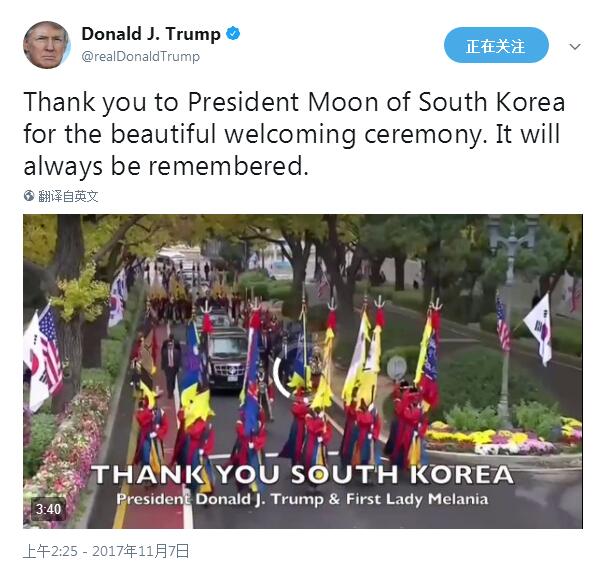 特朗普還發推感謝文在寅,表示會永遠銘記這麼美麗的歡迎儀式。