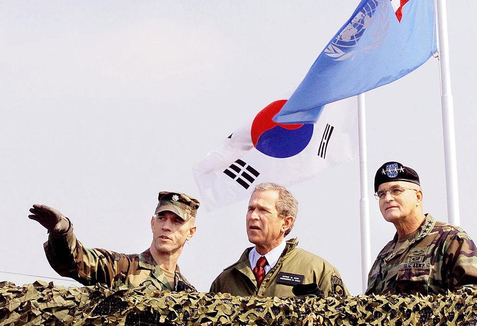 2002年,小布什抵達非軍事區附近火車站,並通過望遠鏡眺望朝鮮。