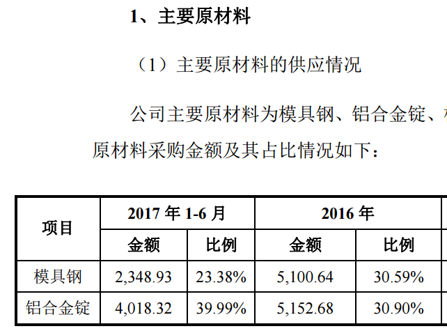 根據招股説明書書第178頁披露的採購數據顯示,合力模具在2017年上半年採購鋁合金錠4018.32萬元、採購單價為1.25萬元/噸,對應該公司在2017年上半年的鋁合金錠採購量應當為3214.66噸。