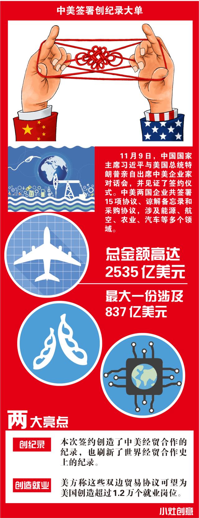 《環球時報》記者獲悉,9日簽約儀式上,中美兩國企業共簽署15項協議、諒解備忘錄和採購協議,涉及能源、航空、農業、汽車等多個領域。商務部國際貿易經濟合作研究院國際市場研究部副主任白明9日接受《環球時報》記者採訪時表示,這樣規模的大單令人震撼,也是隻有世界前兩大經濟體能夠達成的歷史性合作。復旦大學美國研究中心副主任宋國友則對《環球時報》記者表示,得知2535億美元的數字時感到有些吃驚,數字之大出乎他的意料。宋國友稱,2016年中美雙邊貿易額為5243億美元,但此次在特朗普訪華期間中美之間達成的經貿易合作就已達到2535億美元,這在全球經貿史上確實是一個創紀錄的奇蹟。