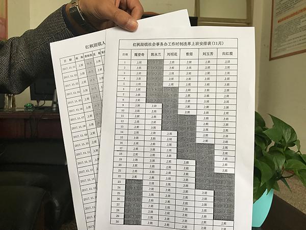 紅楓湖鎮社會事務辦主任耀登奇告訴澎湃新聞,在被確定為試點崗位時,單位的年輕人擔心沒辦法照顧家裏小孩,但通過AB角權責分明後,這一問題也得到解決。