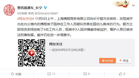 【環球網綜合報道】據上海市長寧公安局官方微博發佈消息稱:11月8日上午,上海攜程商務有限公司向長寧警方反映稱,發現其開辦在辦公樓內的攜程親子園存在工作人員疑似傷害在園幼兒身體的行為。警方立即派員到場控制了4名工作人員,現其中3人因涉嫌虐待被監護、看護人罪已被依法刑事拘留。案件仍在進一步調查中。