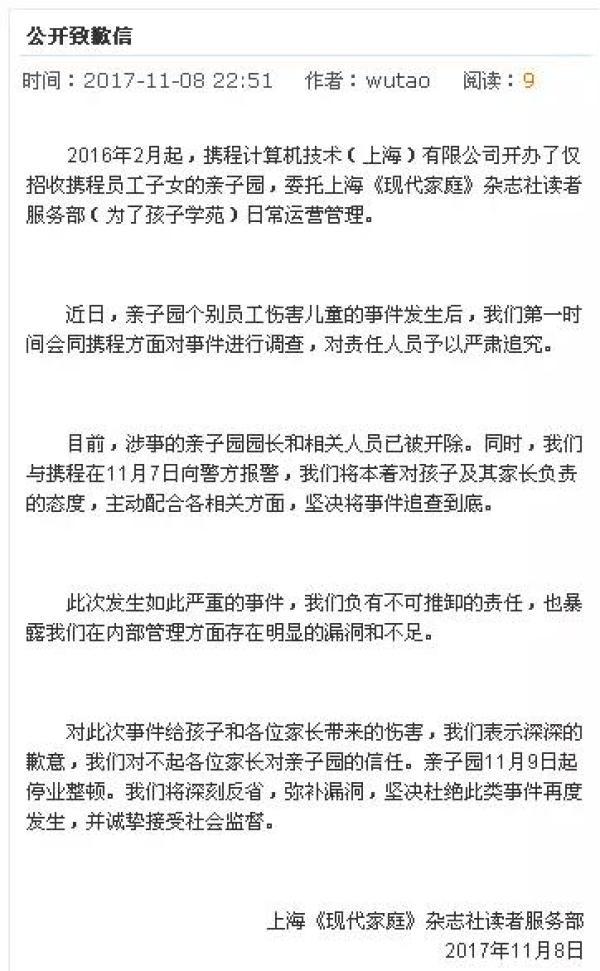 此次事件中,社會各方高度關注攜程親子園的受託管理機構。攜程親子園是攜程開辦的企業內部托育點,委託《現代家庭》雜誌社讀者服務部(為了孩子學苑)日常運營管理,自2016年春節後正式運營。《現代家庭》雜誌社讀者服務部屬獨立法人單位,目前已就此事件發表公開致歉信。