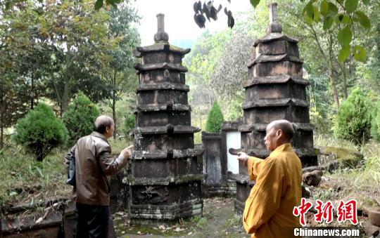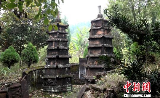 中新網郴州11月8日電 “我們目前發現的古墓塔有36座,分佈在寺廟周圍的山林之中,其中有13座已經經過了專家鑑定。”11月8日,湖南郴州甦仙區龍巖古寺住持釋禮春師傅向記者介紹,該寺發現的墓塔林中,還有一座極為罕見的雙子七層墓塔。