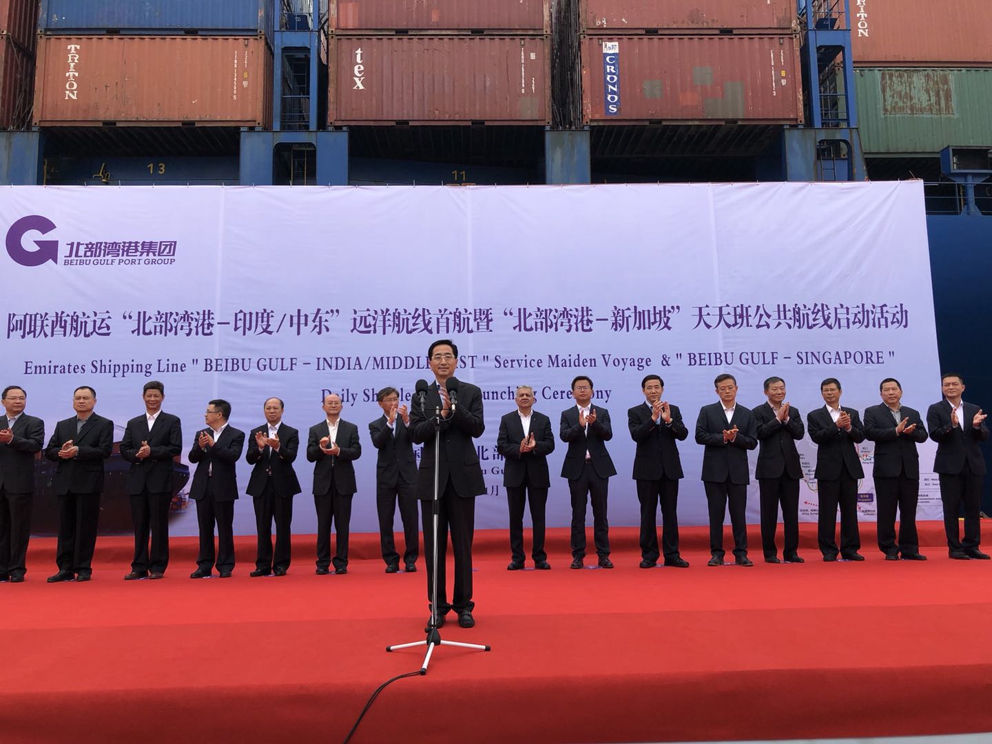 9日上午,採訪團來到中馬欽州產業園區,參加由阿聯酋航運運營的“北部灣港-印度/中東”遠洋航線首航暨“北部灣港-新加坡”天天班公共航線啓動活動。廣西自治區政府副主席張曉欽宣佈航線正式啓動,標誌着北部灣港直航新加坡、通達印度/中東等地的遠洋航線正式開通,也是中新互聯互通南向通道有效延伸及開拓國際中轉業務的關鍵一步。