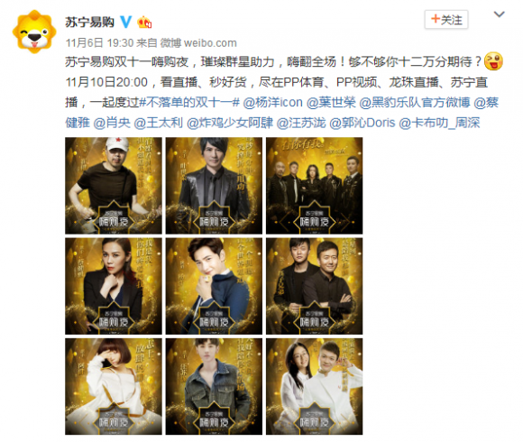 這份節目單之所以是疑似,在於目前與蘇寧官微、海報的預熱宣傳大部分相吻合。相信在11月10日當晚,在羣星璀璨的南京國際博覽中心,蘇寧易購會帶給所有現場和觀看直播的觀眾一場嗨到極致的雙十一晚會。