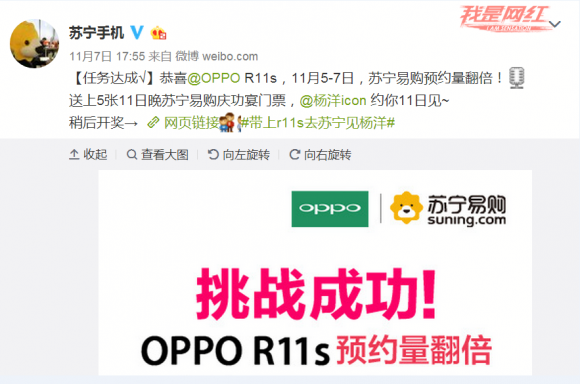 11月7日,蘇寧手機官方微博宣佈OPPO R11s預約翻倍任務挑戰成功,並抽取了5名幸運粉絲,送上蘇寧易購慶功宴門票,可在11月11日當天前往蘇寧易購總部,與男神楊洋約會,獨家福利簡直逆天。