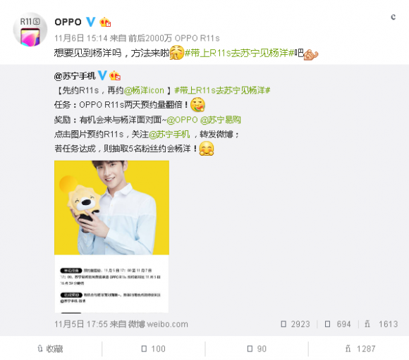 11月5日,蘇寧手機官方微博發佈話題#帶上R11s去蘇寧見楊洋#,並承諾只要OPPO R11s兩天預約量翻倍,即抽取5名粉絲在11月11日當天約會楊洋,瞬間引發上千轉發,蘇寧易購平台OPPO R11s的預約量也爆發式增長。