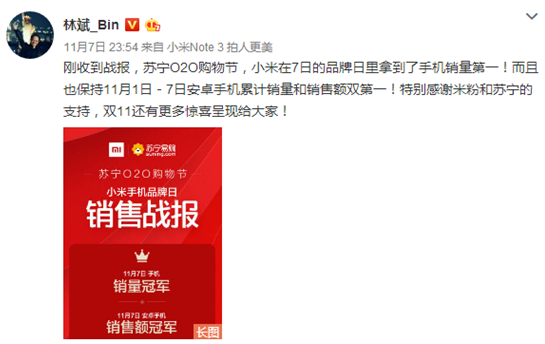 如此給力的銷售戰績,也讓小米總裁林斌按耐不住喜悦之情,11月7日當晚,林斌微博發佈蘇寧O2O購物節小米品牌日銷售戰報,小米奪得當日手機銷量第一,並且保持11月1日-7日安卓手機累計銷量和銷售額雙第一,林斌在微博中表示“特別感謝米粉和蘇寧的支持”。