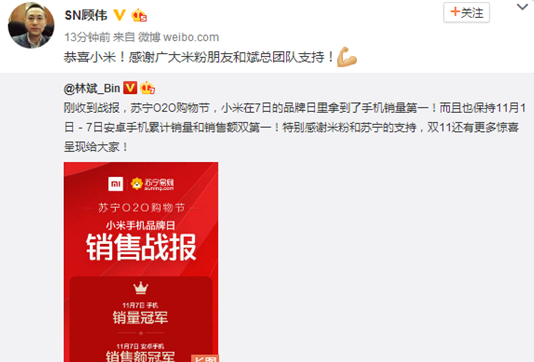 11月8日,蘇寧雲商副總裁顧偉轉發小米總裁林斌的微博,並配文“恭喜小米!感謝廣大米粉朋友和斌總團隊支持!“