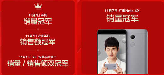 在蘇寧的即時戰報中,小米手機奪得五連冠,分別是11月7日手機銷量冠軍、安卓手機銷售額冠軍、11月1日-7日安卓手機銷量/銷售額雙冠軍,並且紅米Note 4X也奪得11月7日手機單品銷量冠軍。