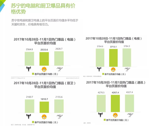 當然,僅僅是有現貨只能説明其供應鏈優勢明顯,在雙十一這一剁手節點,消費者最關注的還是價格。據艾瑞監測數據顯示,蘇寧在電腦、通訊、電視和廚衞等家電3C品類上,平台頁面價均有明顯優勢,可以説是三大電商平台中,價格優勢最明顯的,其中廚衞產品的均價比京東要低了300元以上。