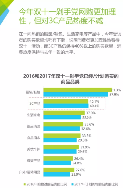 在全民買買買的同時,今年剁手黨對雙十一更加理性,在艾瑞的調研數據中,往年最暢銷的服裝、鞋包、生活家電等產品,今年消費慾望普遍下降,而唯獨3C產品熱度不減,相比去年雙十一,今年消費者對3C產品的消費需求持續提升。