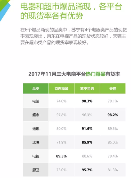 在艾瑞發佈的雙十一剁手攻略中,6個爆品湧現的品類中,蘇寧易購有四個電器品類有貨率最高,分別是電腦、通訊、冰洗和廚衞,有貨率都要高於京東10%以上,其中電腦和廚衞產品的有貨率,更比京東高了15%—20%。