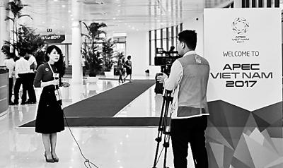 11月5日,在越南峴港,媒體記者在亞太經合組織領導人會議周國際媒體中心進行報道。2017年亞太經合組織(APEC)領導人會議周6日至11日在越南中部城市峴港舉行。越南主辦方為本次會議周設立的國際媒體中心5日開始運營,迎接來自全球超過2600名媒體記者投入報道工作。 新華社發