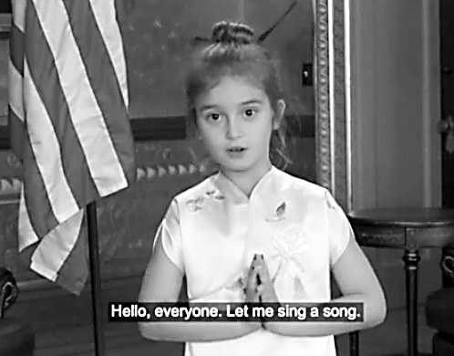 【環球時報駐美國特約記者 侯健羽】“我們的田野,美麗的田野,碧綠的河水,流過無邊的稻田……”8日,美國總統特朗普在訪問中國首日用平板電腦展示外孫女阿拉貝拉用中文表演節目的視頻。視頻中,身穿中國旗袍的阿拉貝拉首先向中國國家主席習近平夫婦問好,然後演唱包括《我們的田野》在內的著名中文歌曲,接着她還背誦了《三字經》和唐詩《望廬山瀑布》以及《早發白帝城》。萌萌的童音俘獲了億萬中國網民的心。