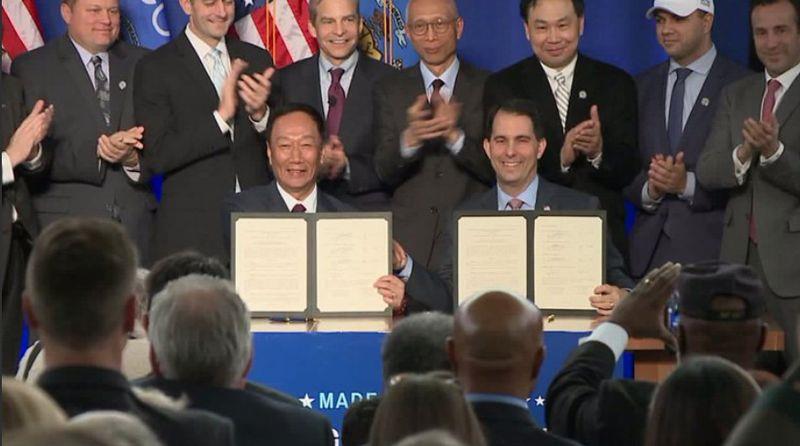 郭台銘與沃克當地時間10日完成簽約,鴻海若在拉辛(Racine)附近地區投資100億美元興建新的顯示螢幕工廠與園區,威斯康星州將提供最高可達30億美元的税務獎勵;為符合完整的獎勵優惠,鴻海還需聘用1.3萬名工人。這也是美國史上最大一筆州政府對境外公司所提供的税務獎勵。