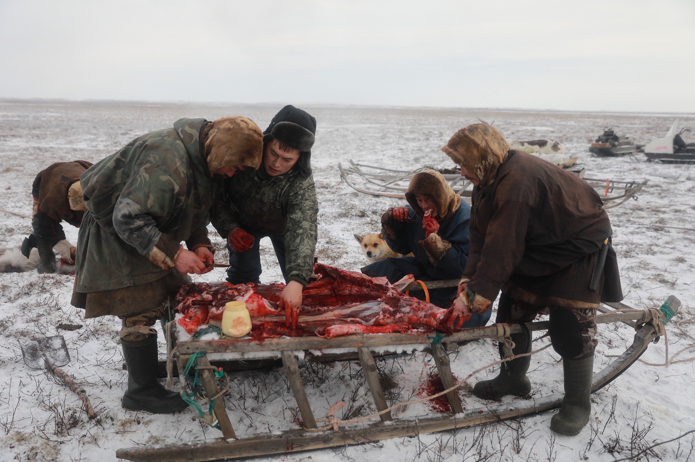 喝鹿血,吃生肉,依然是涅涅茨人的日常習慣。