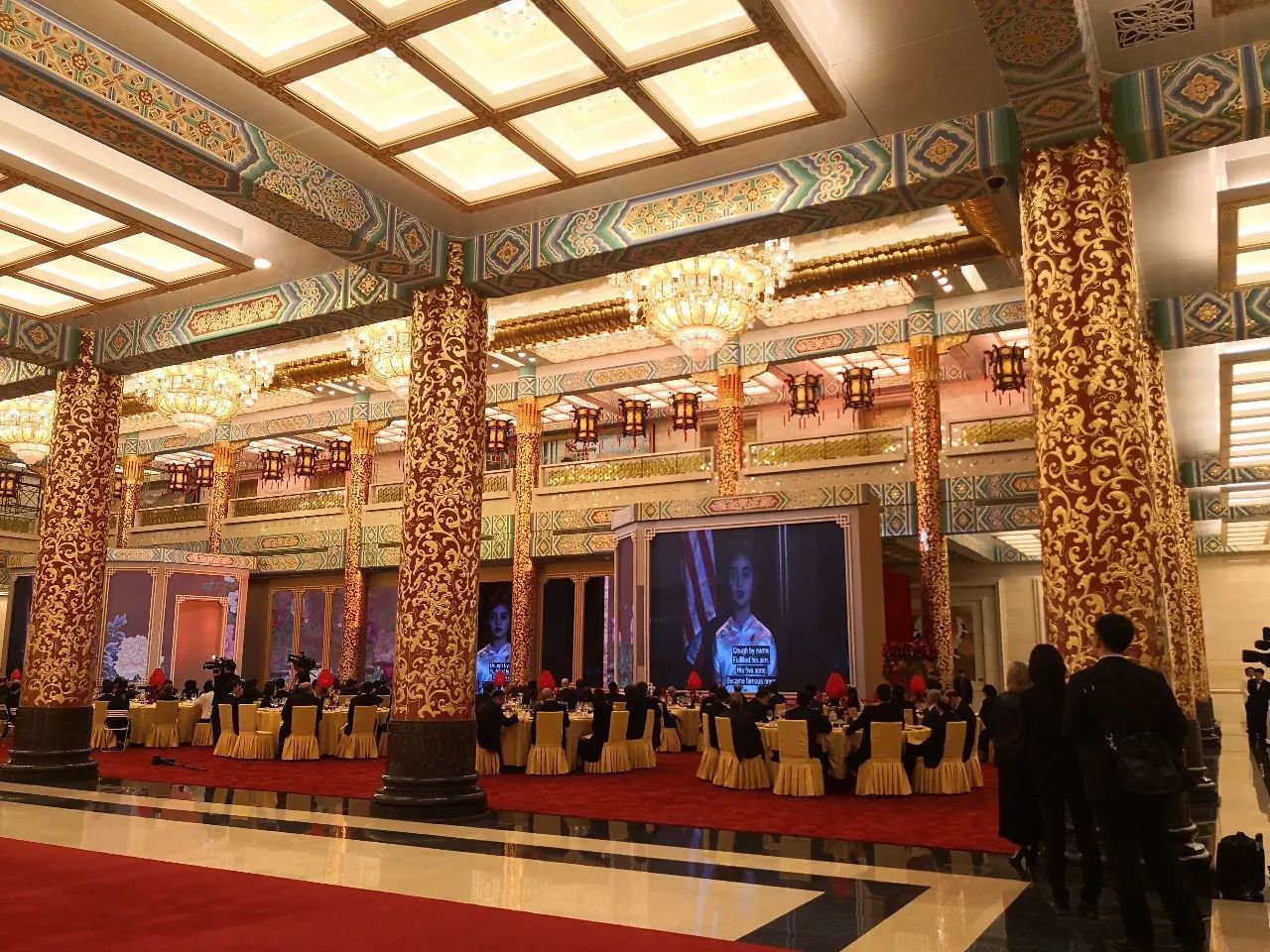 9日晚上,人民大會堂金色大廳歡迎晚宴上有個很大的屏幕,放了一段特朗普的訪華視頻。