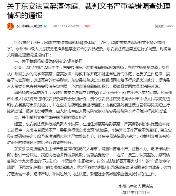 據永州市中級人民法院通報透露,2017年8月22日中午,東安縣法院蘆洪市法庭副庭長魏凱揚,應同學楊某某邀請,陪同從廣州回東安的同學鄧某某、唐某飲酒,導致下午開庭不能正常進行而休庭,違反了工作紀律,損害了法官形象,造成惡劣的社會影響。