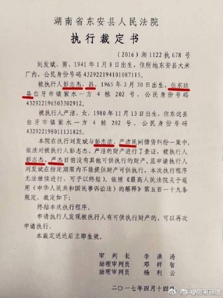通報同時公佈了對此前網友曝光“奇葩裁定書”一事的調查結果:經查,東安縣法院執行局負責人李洪濤,在擔任劉某某與彭某某、嚴某借款糾紛執行案的審判長過程中,文書審查把關不嚴,導致執行裁定書出現7處錯誤。李洪濤對工作嚴重不負責任,經東安縣紀委研究決定,給予李洪濤同志黨內嚴重警告處分。經東安縣法院研究決定,對裁判文書負有校對責任的滕繼延同志給予行政警告處分。