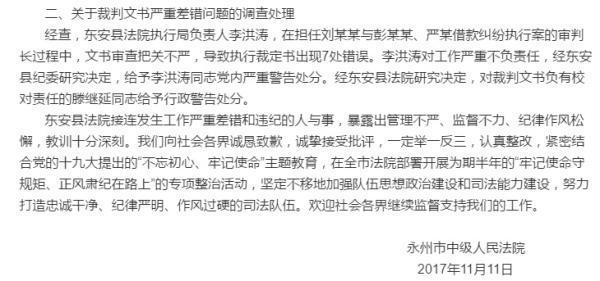 通報稱,“2017年11月5日,網曝‘東安法官魏凱揚醉酒休庭’; 7日,網曝‘東安法院裁判文書多處錯別字’。永州市中級人民法院黨組指派監察室聯合東安縣紀委、東安縣法院監察室進行了調查。”“經查,東安縣法院執行局負責人李洪濤,在擔任劉某某與彭某某、嚴某借款糾紛執行案的審判長過程中,文書審查把關不嚴,導致執行裁定書出現7處錯誤。李洪濤對工作嚴重不負責任,經東安縣紀委研究決定,給予李洪濤同志黨內嚴重警告處分。經東安縣法院研究決定,對裁判文書負有校對責任的滕繼延同志給予行政警告處分。”