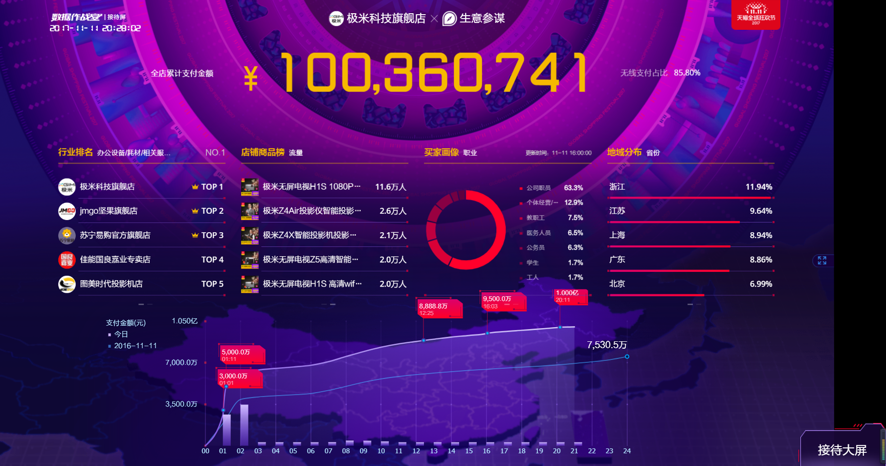 今年是極米無屏電視參加雙11的第四年。自2014年首次參加雙11以來,極米無屏電視一直佔據智能投影品類全網銷售第一的位置。從2014年雙11全網銷售額2000萬元、2015年雙11全網銷售額破7000萬元、2016年雙11當天僅天貓平台支付金額就超過7500萬元,再到2017年的全網銷售額突破2億元。極米無屏電視不僅始終遙遙領先,更屢次刷新自己創造的紀錄,成為行業內不可複製的榜樣。
