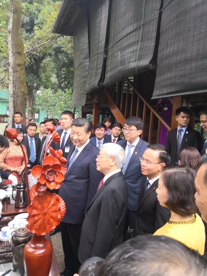 習近平和阮富仲坐到高腳屋中,先品越南茶、再喝越南咖啡。兩人講起這些領域的合作空間,也説起不同文化的交流。