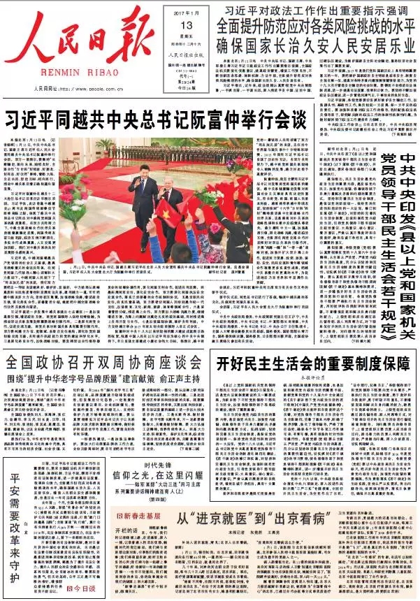 高腳屋前,習近平親自送了一個國禮給阮富仲——人民日報的報紙。都説人民日報是歷史的記錄者,中越兩黨兩國源遠流長的情誼,在這份報紙上有生動的體現。