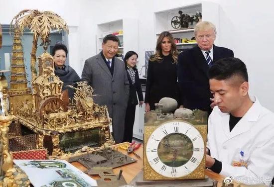 文物醫院,兩國元首夫婦在文物間穿梭,感悟着文物修補的艱辛、故宮工匠的執着,單霽翔指着一幅畫説:“這幅圖300年曆史了,拼了三個月,又修了一年,終於起死回生。”特朗普還關注到一個細節:你們的故宮修復專家非常專注,儘管我們來到了現場,但他們並沒有停下手中的活。