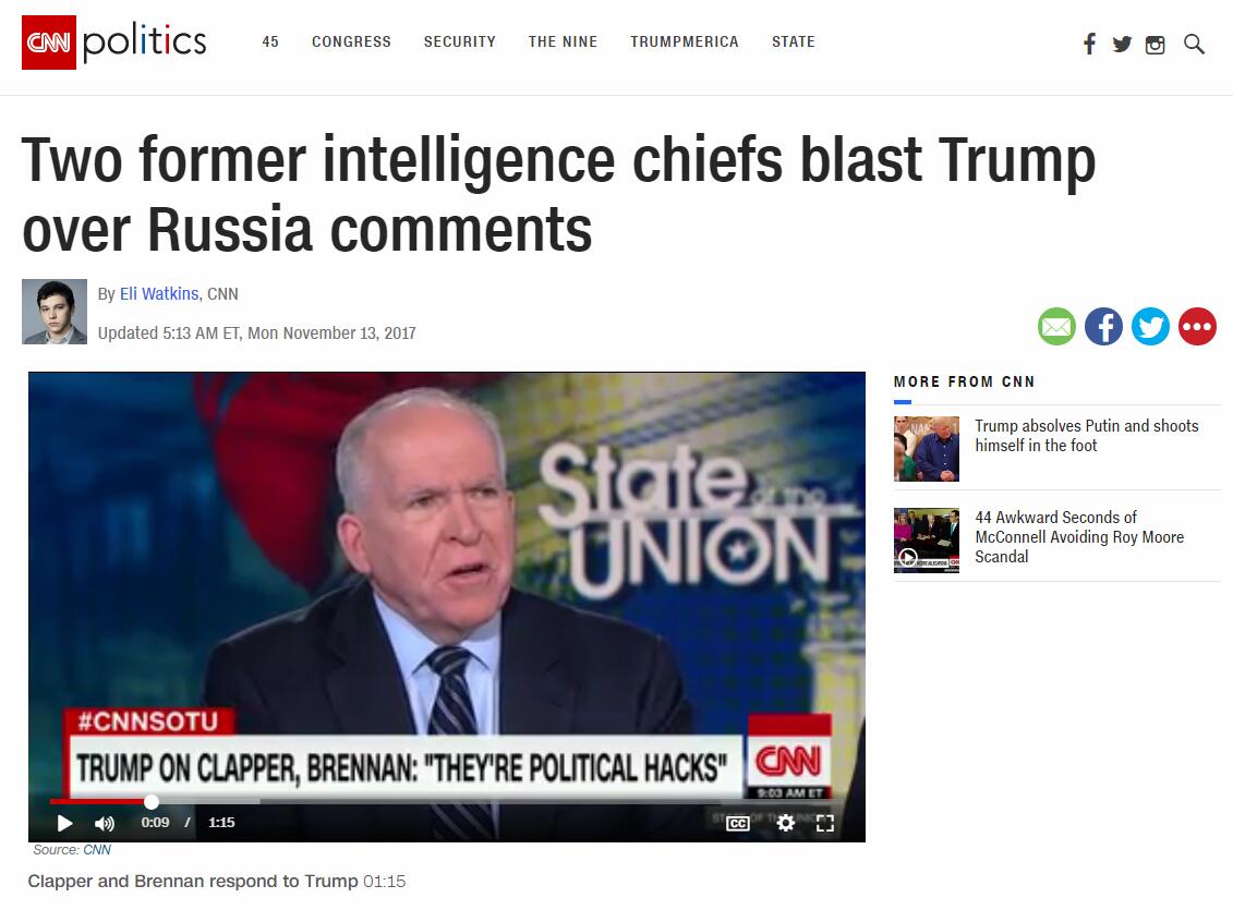 布倫南這一席話是在評論特朗普與普京在APEC峯會會晤後所做出的的表態。據美國《新聞週刊》消息,特朗普見完普京後表示,他認為有關“俄羅斯干涉美國大選”的猜疑使普京備受侮辱。