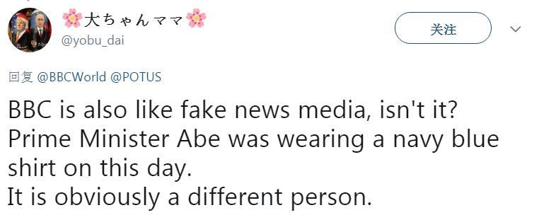 據悉,在英國廣播公司BBC發佈的來自東京電視台的“安倍摔跤”視頻下方,一位名叫“大醬媽媽”的日本網友就怒懟稱:“BBC就像個假新聞媒體一樣,不是嗎?安倍首相當天穿着一件海軍藍T恤,很明顯(和摔倒的)不是同一個人。”她還上傳了幾張照片作對比,也顯示,視頻中摔倒的人身着白色上衣,明顯與媒體隨後給出的美日兩國首腦高爾夫球場合影不同。“通過衣服判斷,我認為視頻中和特朗普一起走的那個才是安倍首相。”