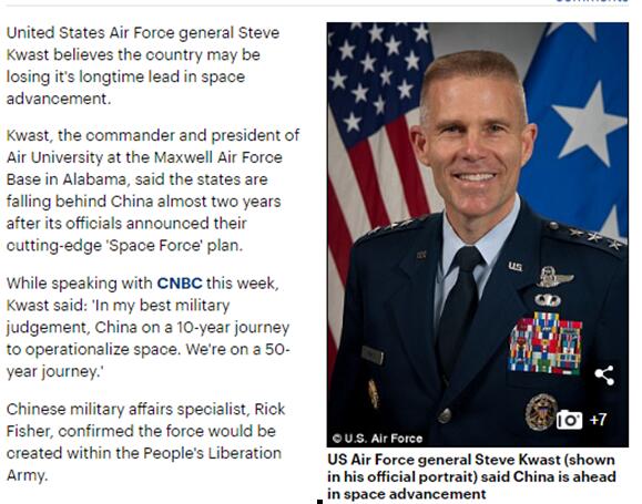 美空軍將領發警告:美國在太空競賽中落後中國40年!
