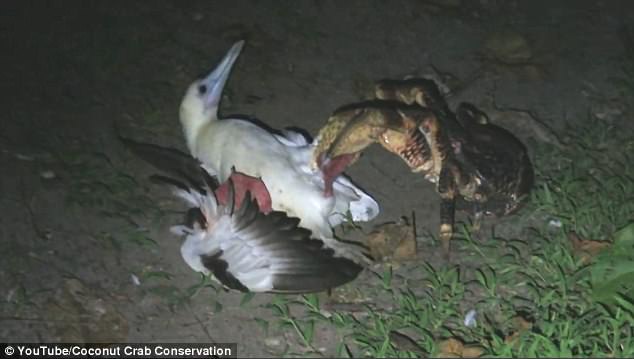 一隻碩大的椰子蟹爬到樹上,趁海鳥還在窩中熟睡之際展開獵殺,其步步為營的獵殺手法令人毛骨悚然。海鳥一下子被蟹鉗刺穿了翅膀,失去重心跌到了沙地上,隨後這隻椰子蟹緩緩靠近這隻絕望掙扎、不斷髮出粗厲尖叫聲的海鳥,鉗斷了其另一隻翅膀。而另外五隻椰子蟹受到血腥味的引誘,紛紛前來,撕碎了海鳥的身體並飽餐一頓。