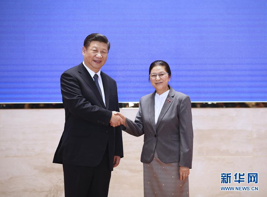 11月14日,中共中央總書記、國家主席習近平在萬象國家會議中心會見老撾國會主席巴妮。 新華社記者 丁林 攝