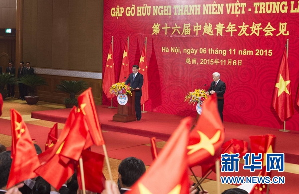 2015年11月6日,中共中央總書記、國家主席習近平和越共中央總書記阮富仲在河內共同會見參加第十六屆中越青年友好會見活動的中越青年代表。