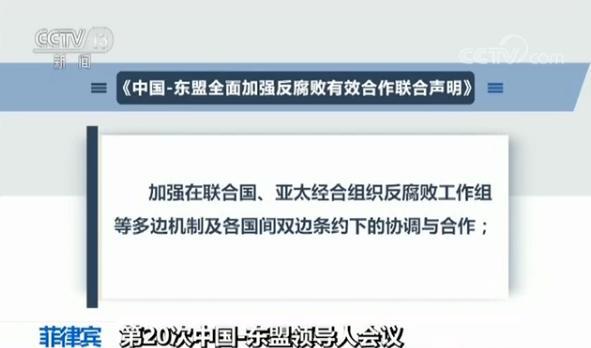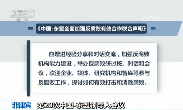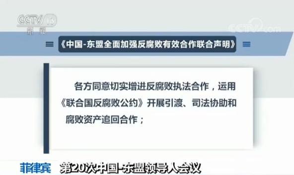 *央視網消息:*13日,在菲律賓馬尼拉舉行的第20次中國-東盟領導人會議上,發表了《中國-東盟全面加強反腐敗有效合作聯合聲明》。這是中國-東盟領導人會議首次在反腐敗領域發表聯合聲明,開啓了本地區攜手治理腐敗的新篇章。