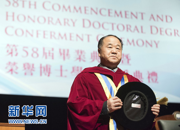 當天在香港浸大校園舉行的畢業典禮上,莫言獲頒授榮譽文學博士學位。浸會大學的讚辭介紹,莫言於2012年獲頒諾貝爾文學獎,是世界當代作家的傑出代表之一,在文學史上樹立了一座豐碑。