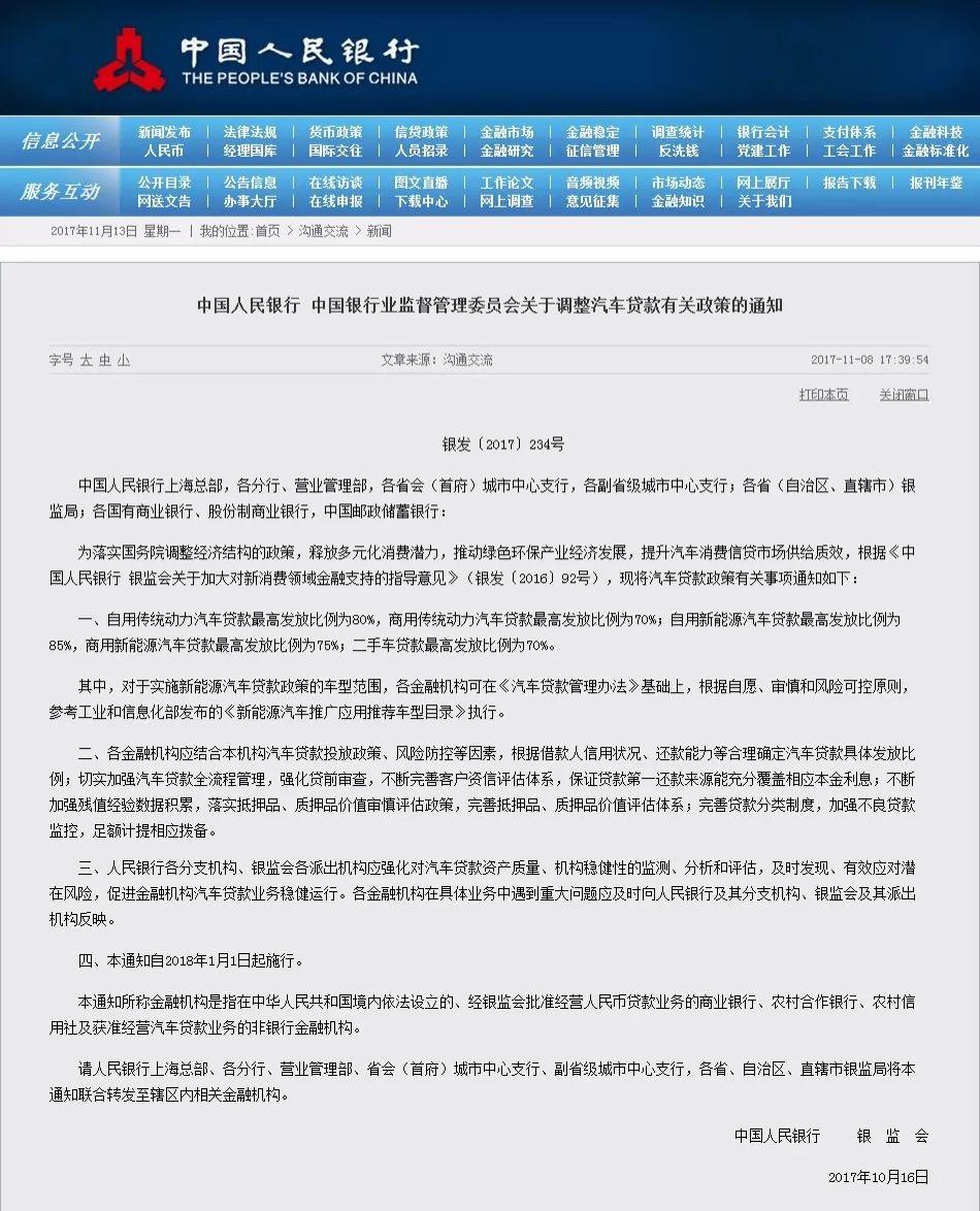 央行和銀監會近日聯合發佈《關於調整汽車貸款有關政策的通知》,宣佈自2018年1月1日起,自用傳統動力汽車貸款最高發放比例為80%,商用傳統動力汽車貸款最高發放比例為70%;自用新能源汽車貸款最高發放比例為85%,商用新能源汽車貸款最高發放比例為75%;二手車貸款最高發放比例為70%。