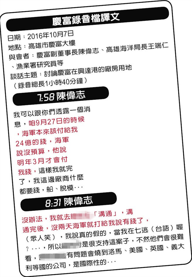 據台灣《中時電子報》消息,14日,國民黨“立委”呂玉玲、馬文君等召開記者會,並公佈了內幕錄音文檔,該錄音文檔顯示:慶富急需第三期履約款24億元,但去年海軍未編列該款項,慶富副董事長陳偉志直接向蔡英文辦公室“喬”(“喬”意為溝通協調)了24億。呂玉玲、馬文君等國民黨“立委”要求蔡英文出面説清楚。