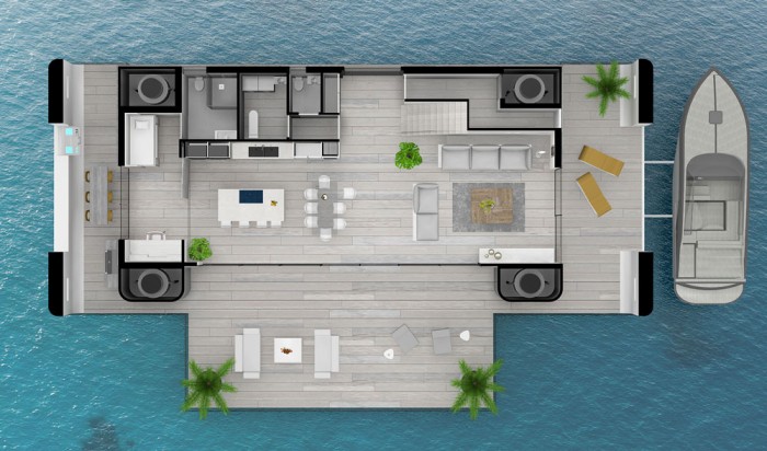 其實,這棟漂浮的房屋如同一艘適宜居住的遊艇,每個單元大約有405平方米,包含4個卧室和4.5個衞生間。這些房屋不僅能產生零排放,而且還能防止颶風的發生。倘若未來的世界真能在水上運行,或許將能避免燃燒化石燃料,減緩全球暖化的問題。
