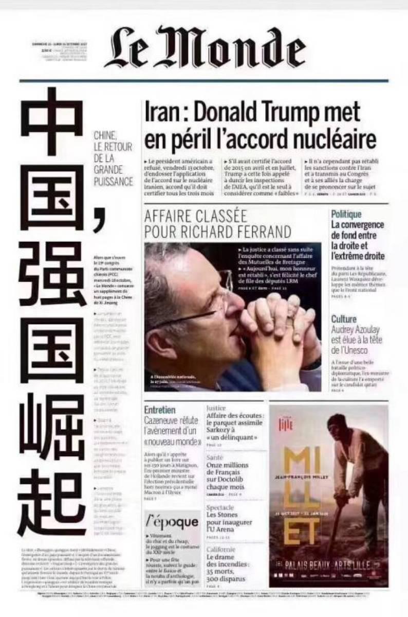10月15日,法國第二大報紙《世界報》在頭版頭條以超大漢字“中國,強國崛起”作為封面,並且用了8個版面介紹強大的中國。在第一部分,《世界報》清晰地寫道:“我們已經進入了中國世紀。”