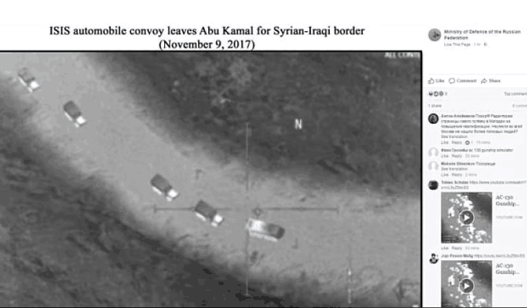 俄羅斯國防部在“臉書”上稱,9日,俄軍在敍利亞和伊拉克邊境使用無人機拍攝到一批黑白照片,並指責這次行動“確定了美國領導的聯盟為IS提供了直接合作和援助的事實”。不過有眼尖的網民發現,其中一張照片和電玩遊戲“AC-130武裝直升機模擬器”於2015年3月上傳到互聯網上的畫面完全相同。