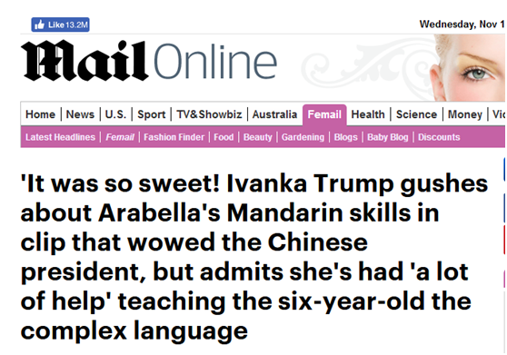 據新華網報道,中美兩國元首夫婦11月8日在故宮博物院寶藴樓茶敍時,特朗普使用平板電腦向習近平夫婦展示外孫女阿拉貝拉用中文演唱歌曲、背《三字經》和古詩的視頻。習近平誇獎阿拉貝拉中文水平進步,説可以打“A+”,表示她在中國已成為小明星,希望她也能有機會來中國。