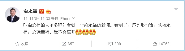 隨後俞永福親自在官方微博闢謠,表示:永福永福,永遠幸福。“我不會離開”。UC聯合創始人、小鵬汽車創始人何小鵬也聲援,“離職、創業、受阻都是沒有的事情。”